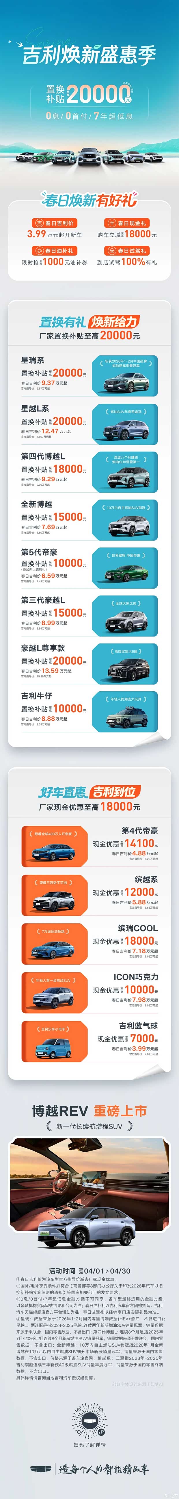 4月吉利焕新盛惠 置换补贴至高20000元