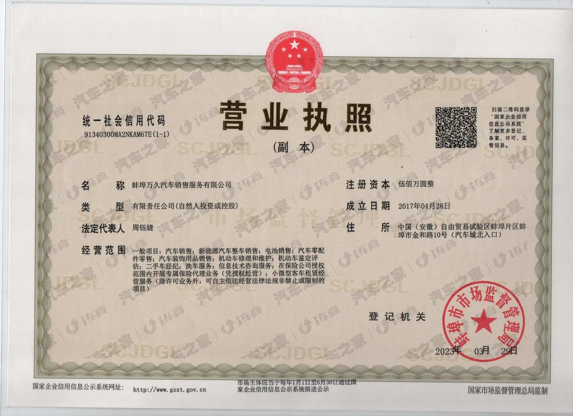 蚌埠万久汽车销售服务有限公司是上汽集团在皖北地区建立的上汽大通销售服务旗舰店,于2014年8月破土动工,2014年11月正式营业,蚌埠万久上汽大通销售服务旗舰店规划面积12000多平方米,总投资2200万人民币,分为车辆展销区、员工办公区、客户休息区、维修服务区及环境绿化区。其中公司维修技术人员20多人。本科以上学历8人,专科以上学历20人,高级技术人员 12人,中级技术人员7人。本公司是集整车销售,配件销售,售后服务,信息反馈四位一体的现代化汽车销售服务企业。蚌埠万久上汽大通销售服务旗舰店是严格按照高标准规划、高起点建设的集于一体的现代化企业,以专业的营销组织,高效的维修队伍,自动化的办公程序,热情周到的服务,奠定上汽汽车在皖北地区良好的口碑,并为公司进一步的发展打下了坚实的基础。