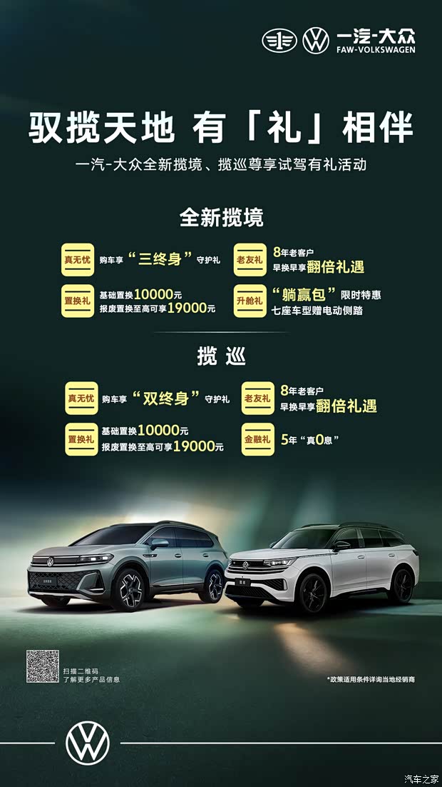 #驭揽天地 有「礼」相伴 姐妹们/兄弟们!听我说!如果你最近在看大五座/七座SUV,如果你向往春天的自驾游,那么3月28-29日这场一汽-大众全新揽境、揽巡活动,你不能错过! 进店就送:定制露营礼盒/随行杯(颜值超高,拍照神器!) 试驾再送:不仅能深度体验揽境/揽巡的旗舰魅力,还能抽盲盒大礼! 重磅剧透:一等奖可能是大疆Mini无人机、戴森吸尘器、千元京东卡……(100%中奖,绝不空手!) 不只是试车,更是体验“旗舰生活”,还在纠结?来这里找答案! 销售小哥说了:“全新揽境、揽巡不仅是大,更是好开、耐用、安全!” 这话我信了! 想买车的看这里 活动期间有“总经理签售价”,比平时多优惠2000-3000元! 还有0首付/0利率金融政策,置换补贴高达2万! 这波政策,真的是“错过拍大腿”系列! 怎么参加? 时间:3月28日-29日(本周末) 地点:[您的经销商地址/门店名称] 方式:点击头像私信我【试驾】,立刻锁定名额+领取专属进店礼! #一汽大众全新揽境、揽巡 #驭揽天地有礼相伴 #揽境 #揽巡 #试驾有礼 #SUV推荐 #周末去哪儿 #薅羊毛