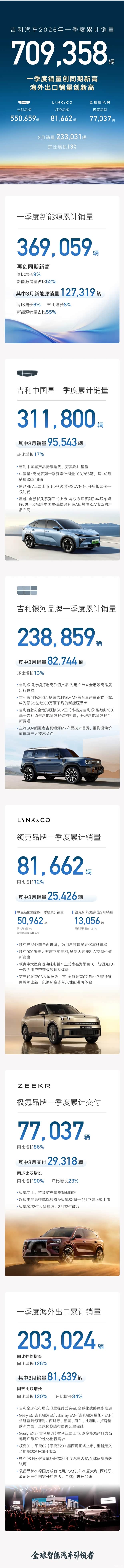 吉利汽车一季度销量突破70.9万辆创同期新高,3月出口销量超8万辆创新高