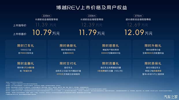更让人惊喜的是,博越REV上市惊喜价仅10.79万-12.09万元,相比预售价直降2万元,以10万级的价格,带给用户20万级的用车体验。没有高溢价,没有套路,真正实现长续航增程技术普惠,让普通家庭无需背负沉重购车压力,就能拥有一台续航无忧、好开省油、安全舒适的全能家用SUV,彻底打破“长续航=高价格”的市场惯例。